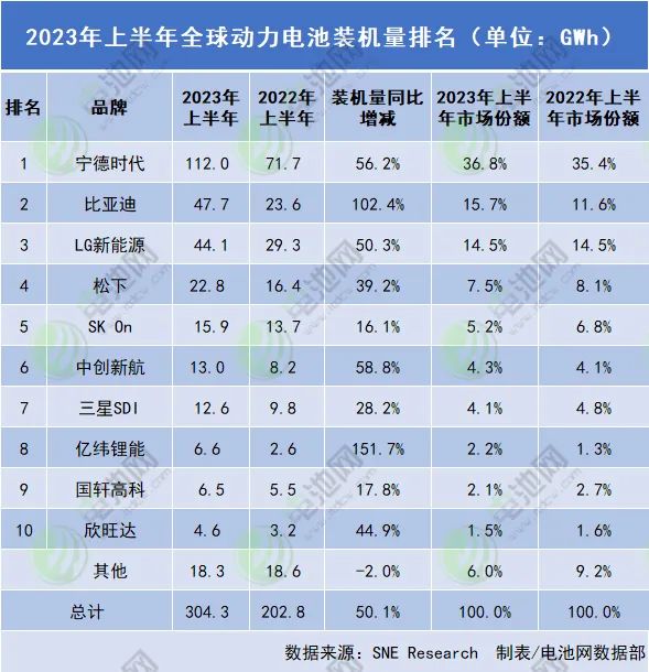 從全球來看,韓國研究機(jī)構(gòu)SNE Research發(fā)布的最新數(shù)據(jù)顯示,1-7月,全球新登記動(dòng)力電池裝車量為362.9GWh,同比增長49.2%;1-7月全球動(dòng)力電池裝車量TOP10排名中,中國6家企業(yè)市場(chǎng)份額進(jìn)一步提升至62.9%,寧德時(shí)代和比亞迪合計(jì)市占率已超一半份額,達(dá)52.6%。其中,上半年,全球新登記動(dòng)力電池裝車量為304.3GWh,同比增長50.1%。